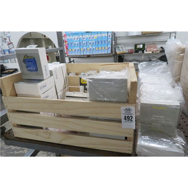 Crate w/Wireless Charging Pads, Earbuds & Phone Cases492 - Crate w/Wireless Charging Pads, Earbuds & Phone Cases