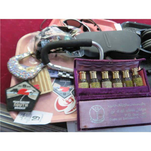 Tray Lot of AKG Headphones, Lock, Mug and Mouse Pad