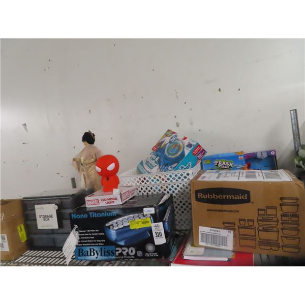Shelf of Hair Roller, Rubbermaid Food Container, Spin and Splatter, Spiderman310 - Shelf of Hair Roller, Rubbermaid Food Container, Spin and Splatter, Spiderman