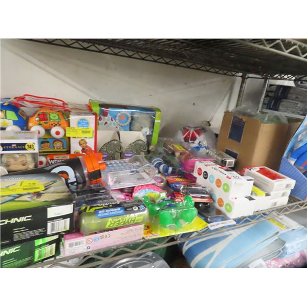 Shelf of Asst. Toys, Gatorade Bottle, Grill Tongs, Fishing Hooks and More