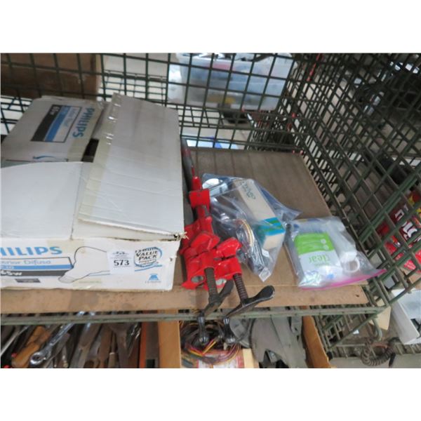 Shelf Lot Red Clamps, Light Bulbs, Ball Joint Remover573 - Shelf Lot Red Clamps, Light Bulbs, Ball Joint Remover