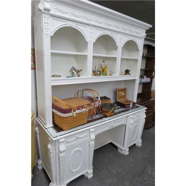 Ornate White Kneehole Desk w/Cabinet Doors & Upper