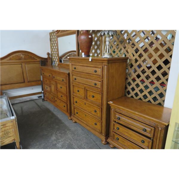 Oak/Rattan Bedroom Set w/Headboard, Dresser, Mirror, Nightstand