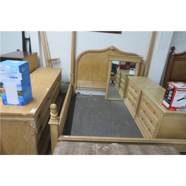 Natural Wood Carved King 4 Poster Bed w/Mirror, Dresser & 2 Nightstands
