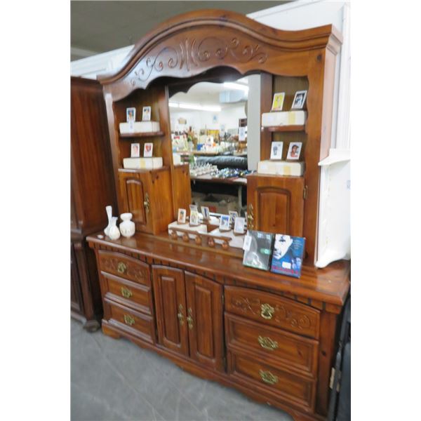 Carved Pine Brass Accent Cabinet w/Mirror & 2 Drawer End Table59 - Carved Pine Brass Accent Cabinet w/Mirror & 2 Drawer End Table