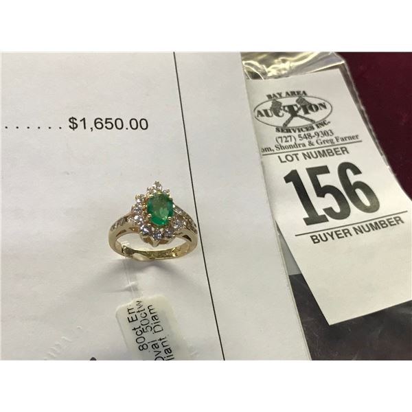 14K YG Emerald & Diamond Ring - Oval Emerald .80CT & 25 Round Diamonds 4.1g (Retail Value $1,650.00)156 - 14K YG Emerald & Diamond Ring - Oval Emerald .80CT & 25 Round Diamonds 4.1g (Retail Value $1,650.00)