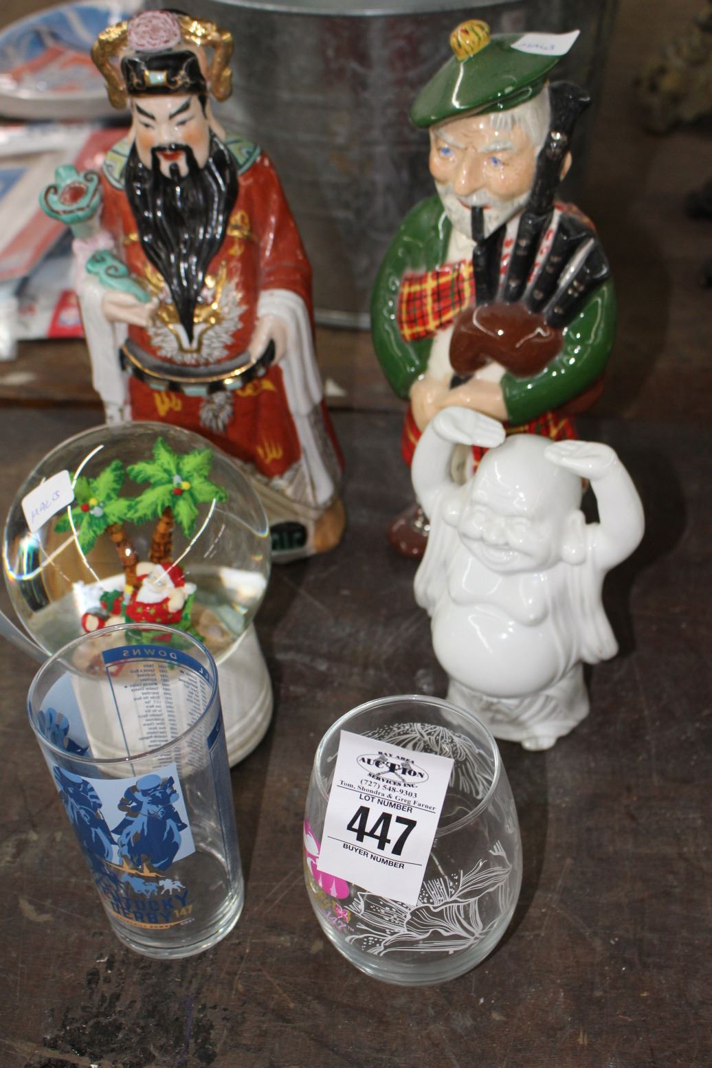 Figural Decanters, Buddha, Santa Snowglobe, Souvenir Glasses