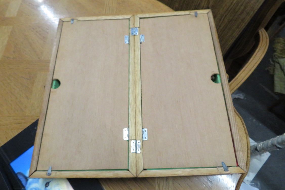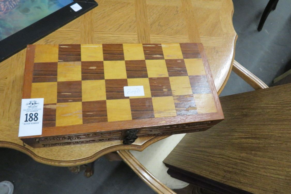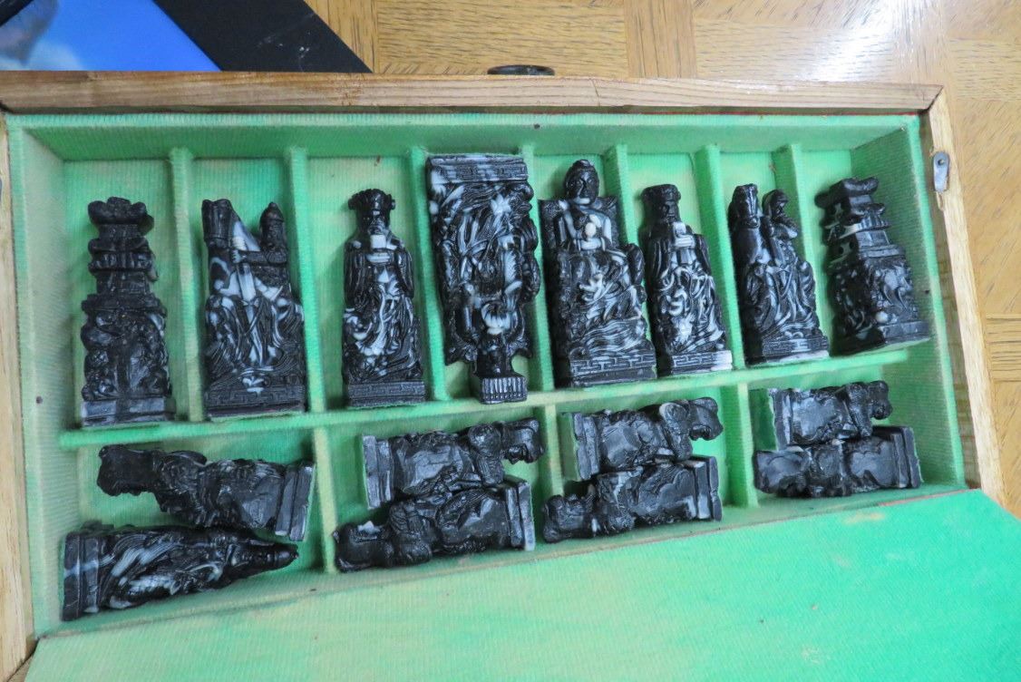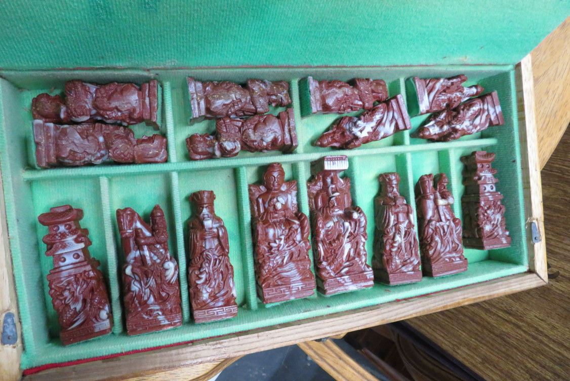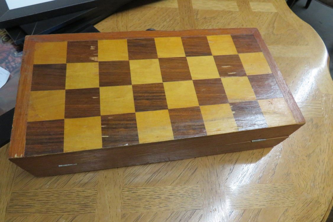 Fold Up Wood Carved Chess Board w/Carved Chess Pieces