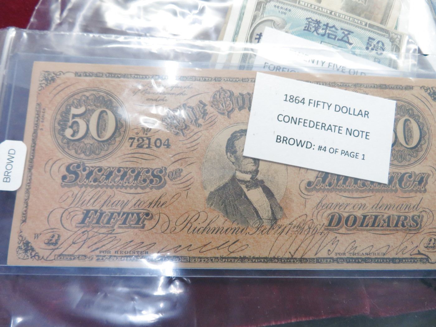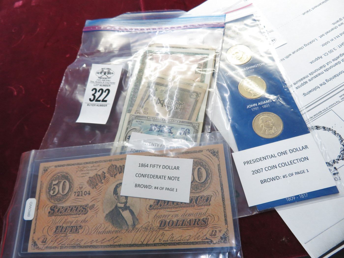 Foreign Currency 1864 $50 Confederate, Presidential $1 Coin Collection