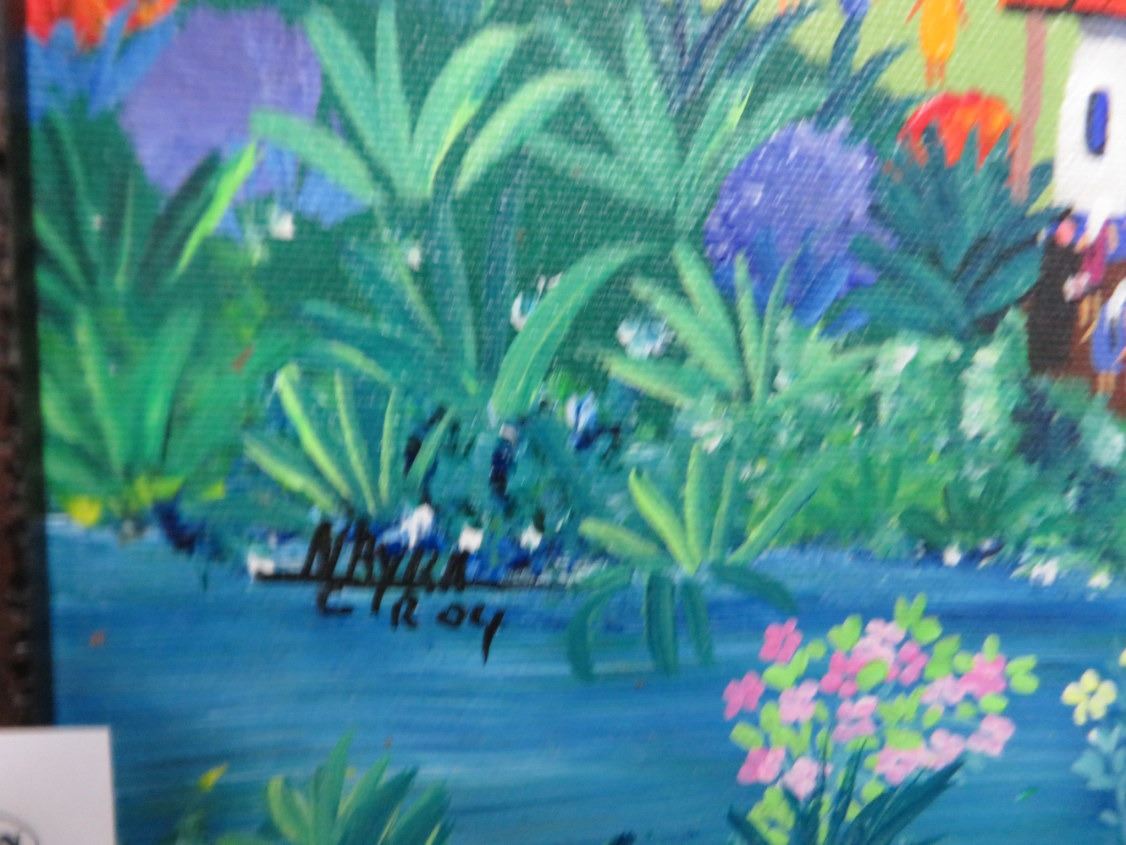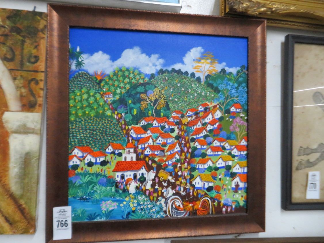 Framed Oil On Canvas Jungle Town Scene - 21" x 21"