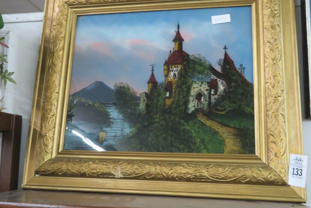 Framed Reversed Painting On Glass Church 28" x 24"