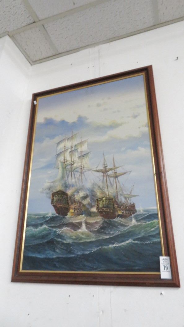 Framed Ship Battle Oil On Canvas - 39" x 27"