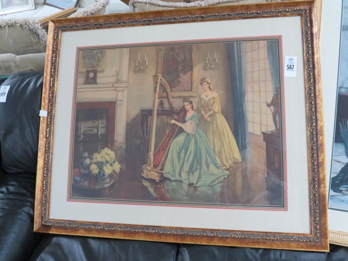 Framed Wall Art Provincial Ladies Playing Harp - Artist Signed - 30 x 36