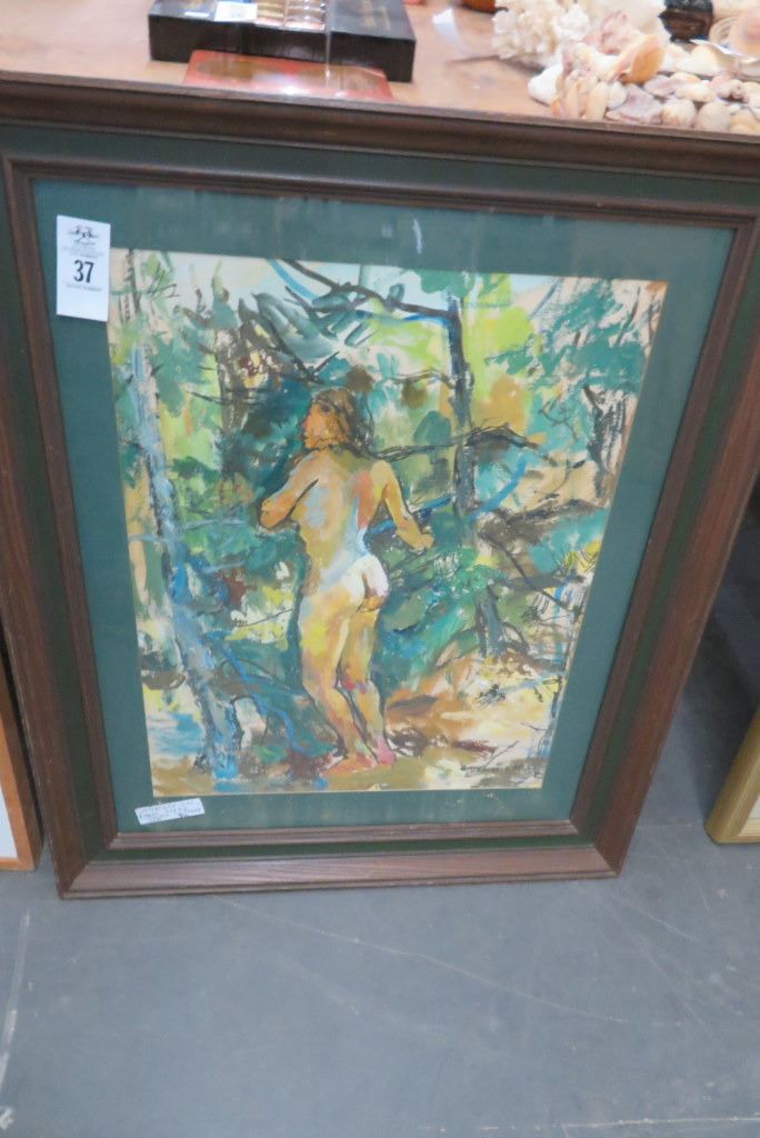 Framed Water Color Nude Woman In Forest -33" x 27"