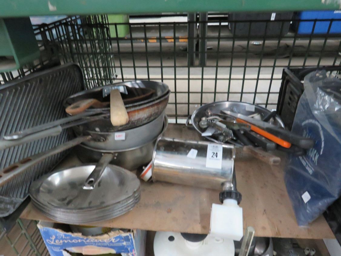 Fry Pans, S/S Platter, Cambro, Utensils On Shelf