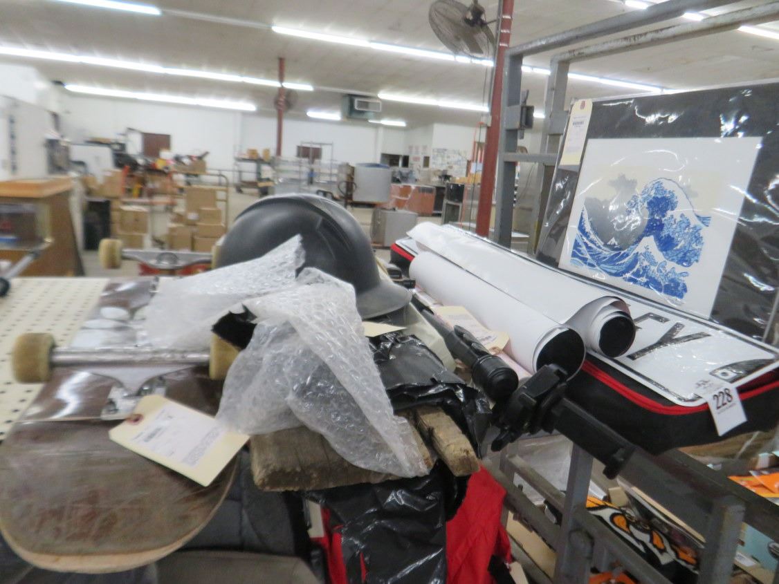 Gasoline Alley Sign, Camera Tri Pod, Skateboard & Hardhat