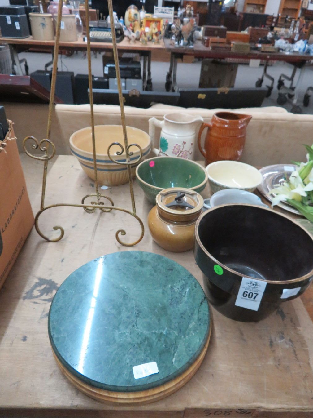 Glazed Pitchers and Bowls, Marble Lazy Susan, Easel