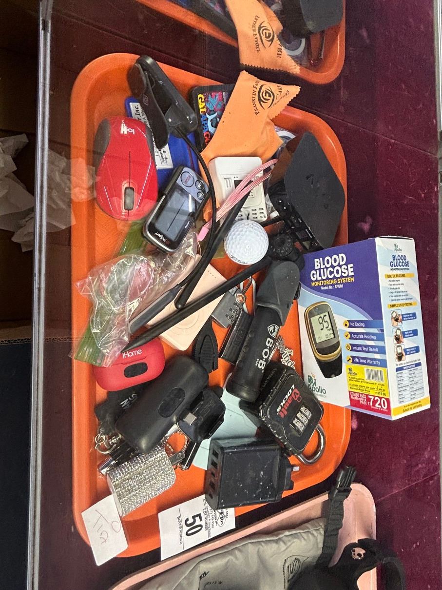 Glucose Monitor, Apple TV Componant, Money Cllip, Asst. Travel Items