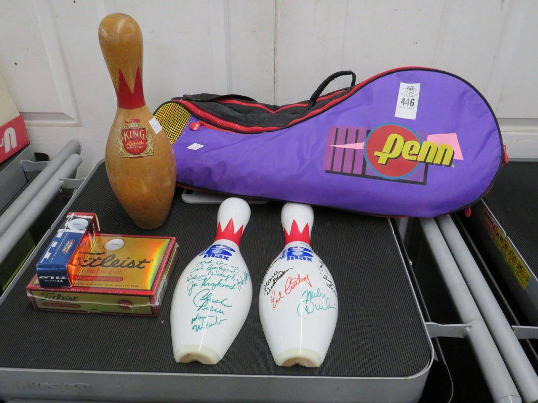 Golf Balls, Tennis Rackets w/Duffle and Bowling Memorabilia