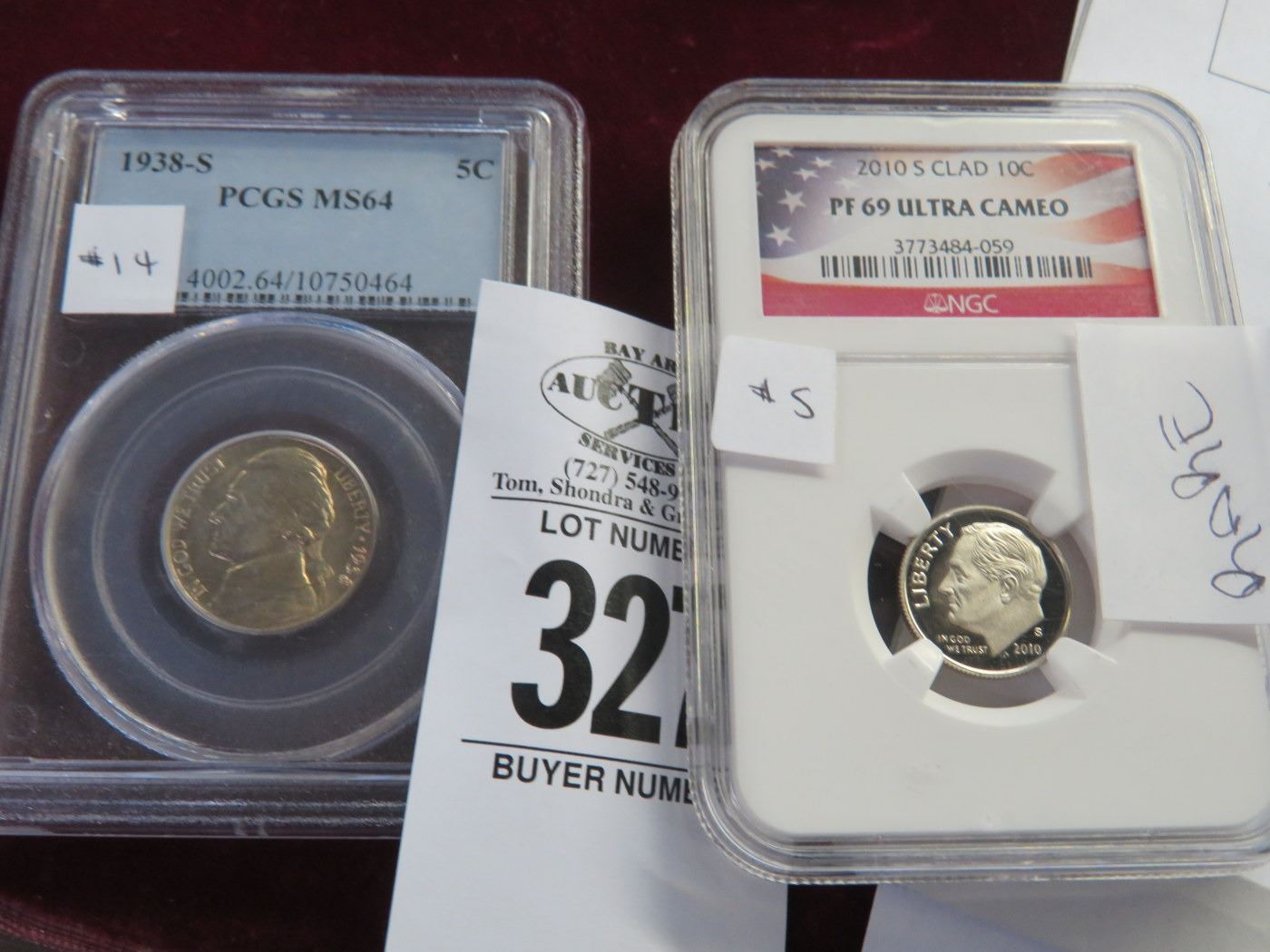 Graded 2010-S Clad Roosevelt Dime, Graded 1938-S MS Jefferson Nickel