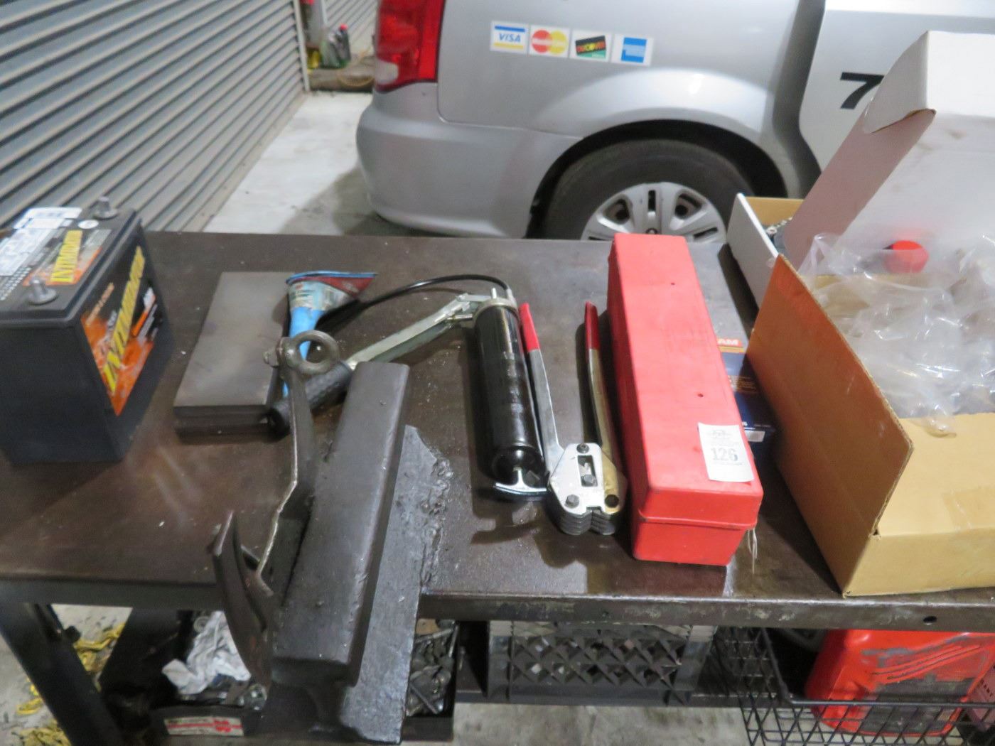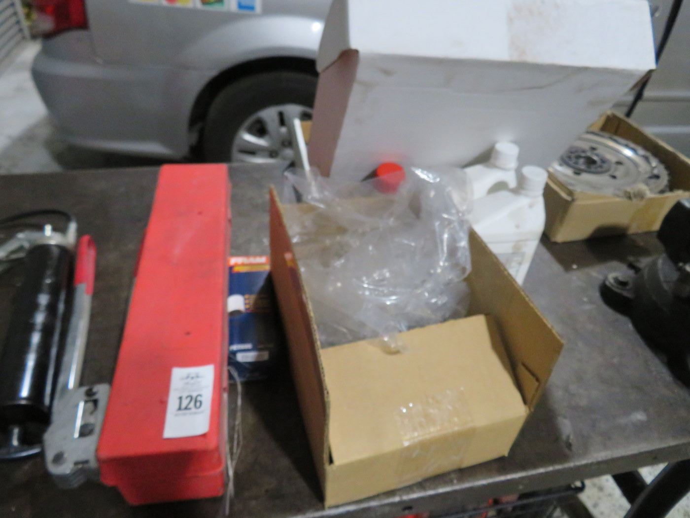 Grease Gun, Safety Triangle, Auto Parts On Bench