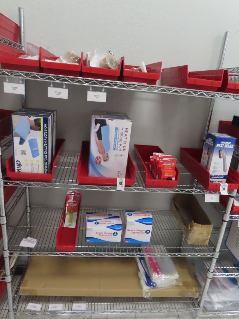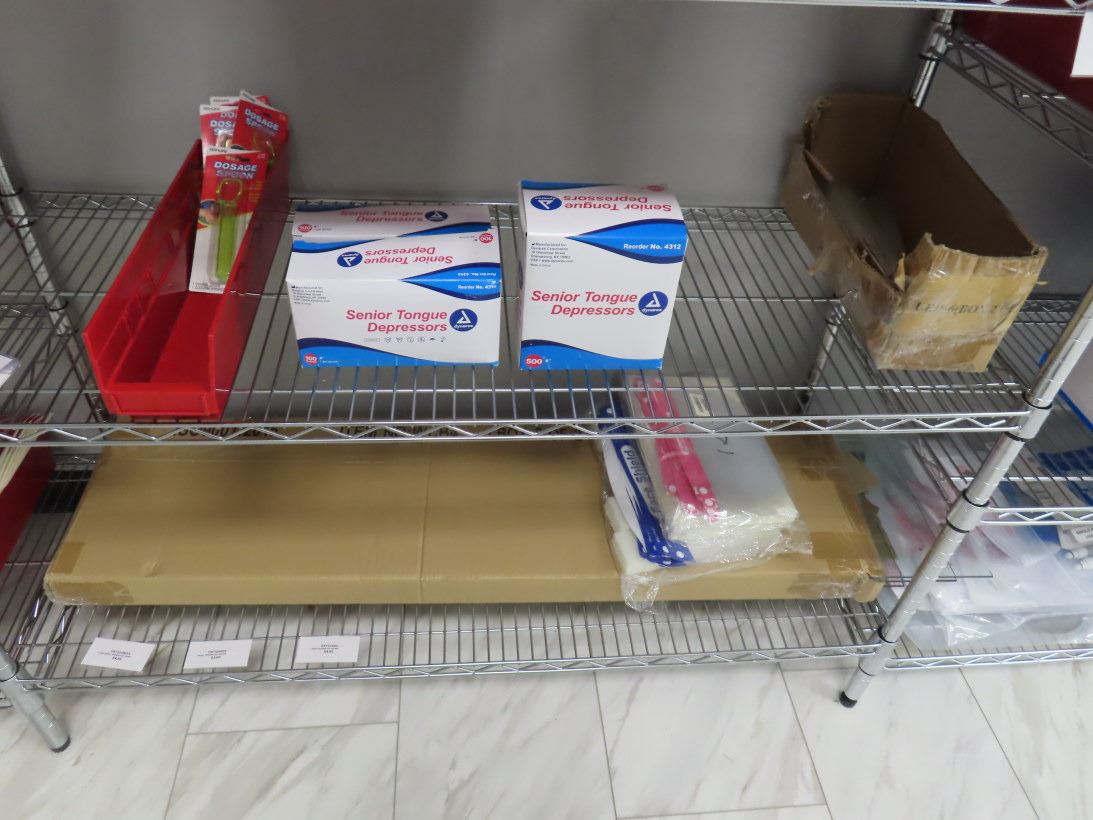 Heating Pads, Gauze, Supplies, Tongue Depressors on Rack