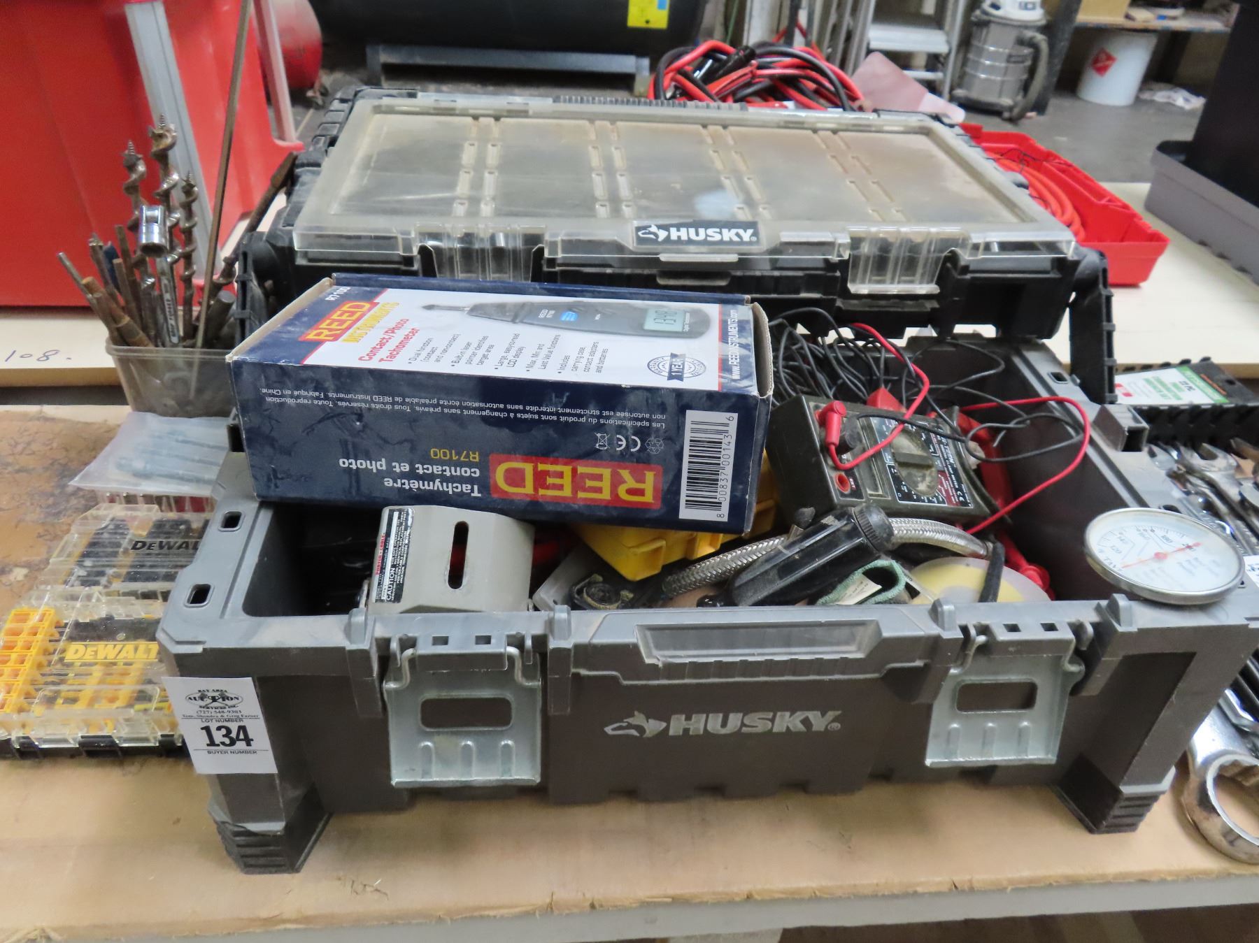 Husky Hardware Bin, Amp Probe, Drill Bits, Supplies