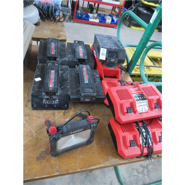 Milwaukee Large Cordless Batteries 5, Chargers 4, Flood Light293 - Milwaukee Large Cordless Batteries 5, Chargers 4, Flood Light