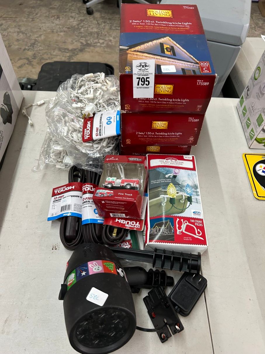 Icicle Lights, Ext. Cords, Holiday Projector, Gutter Light Holder