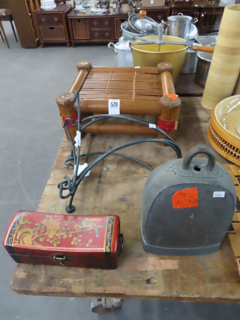 Large Cast Bell, Oriental Storage Box, Stand & Iron Wall Décor