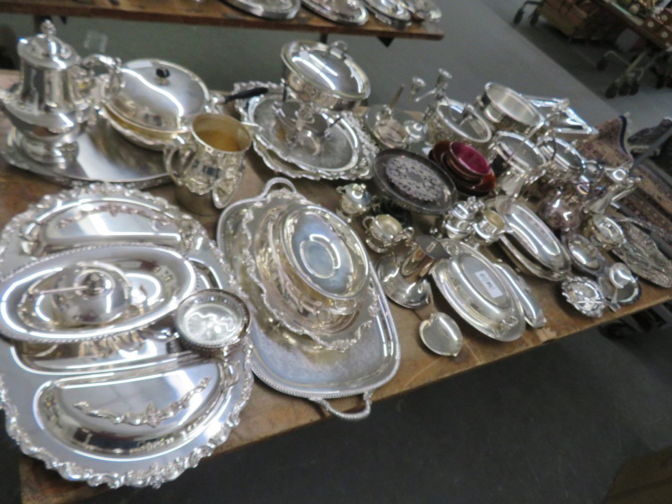 Large Lot of Silverplate Platters, Tea Pots, Pictures & Bowls