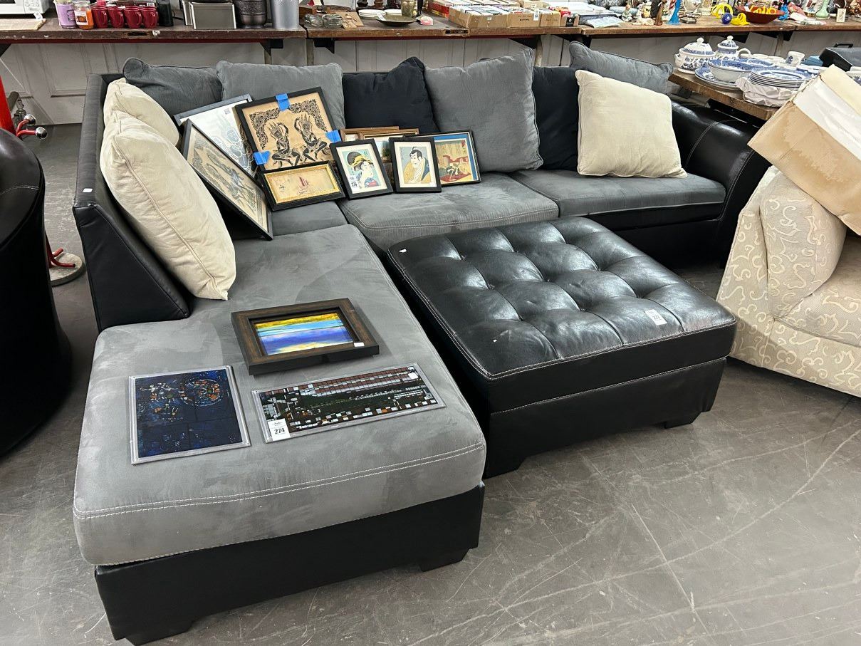 Leather Black/Gray 2 Section L-Shaped Sofa w/Ottoman