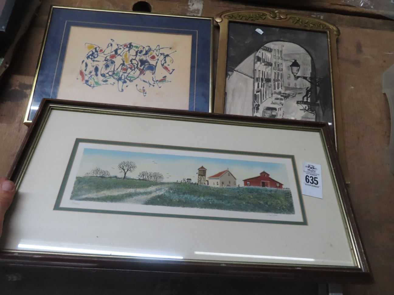 Lot of Asst. Small Art Includes Abstract Litho Street Scene, Barn Signed Litho