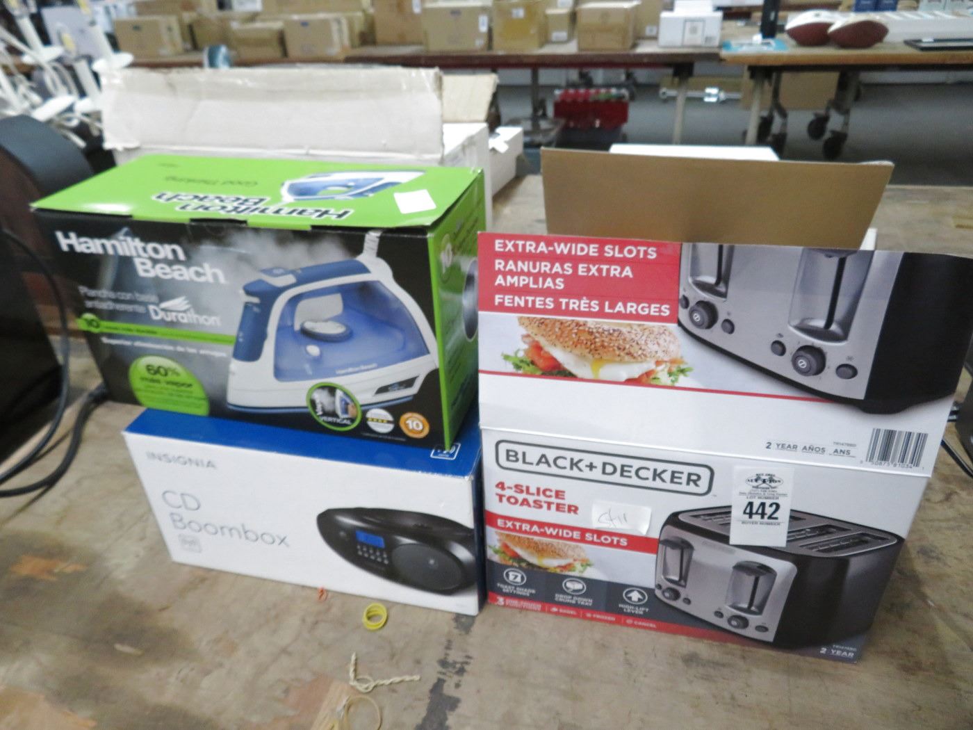 Lot of Hamilton Beach Irons, Insignia Boombox & Black & Decker Toaster
