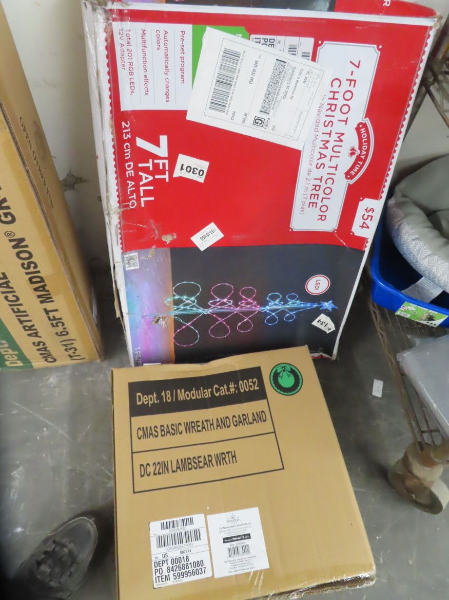 Lot of Wreath w/Garland and 7' Multi Color Christmas Tree