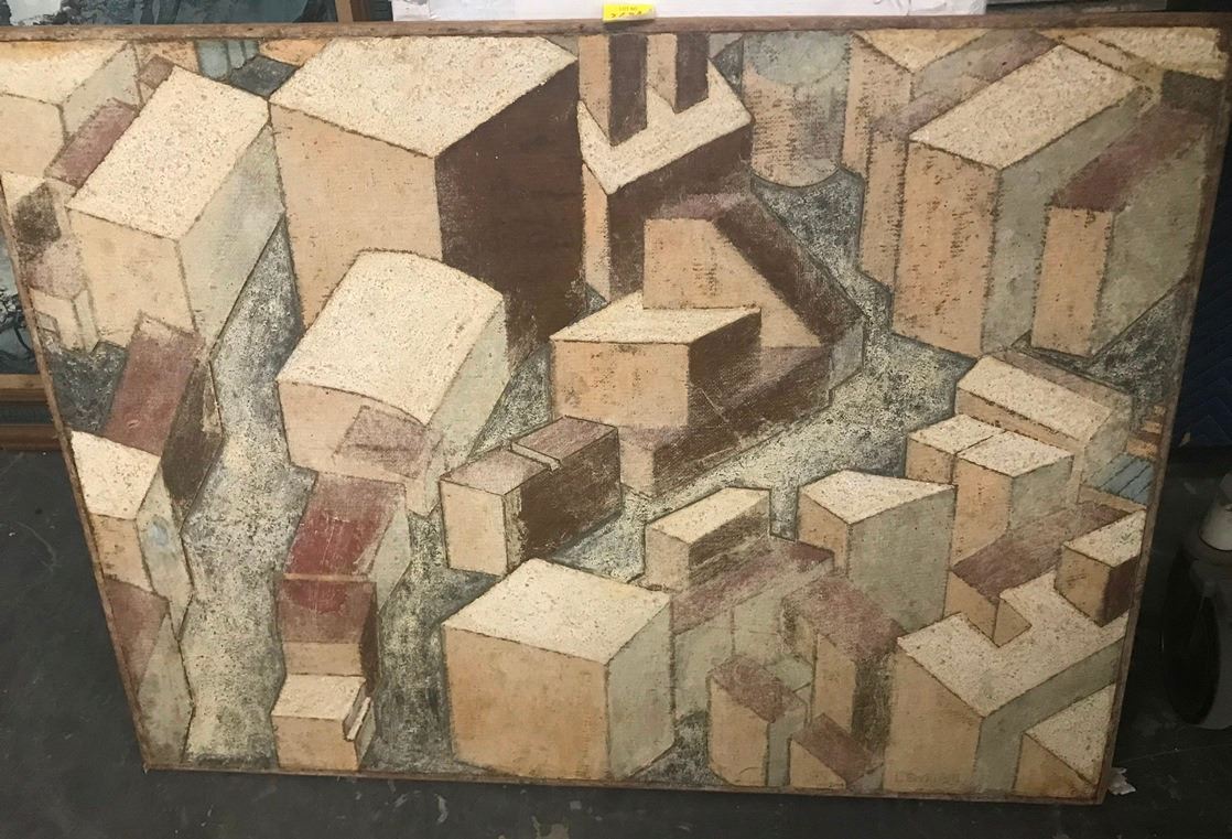 Mid Century Abstract Cityscape Oil Signed Lehman