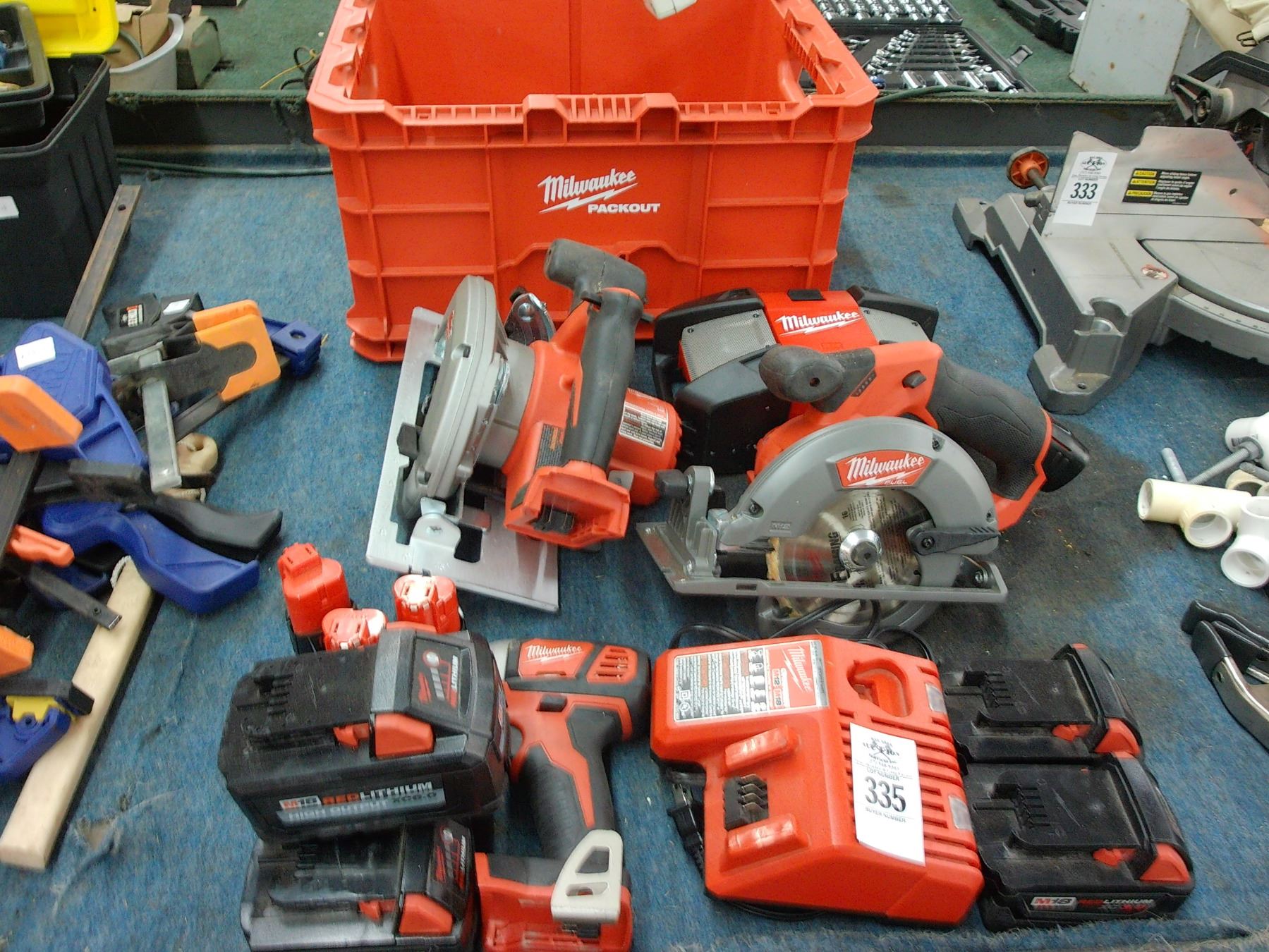 Milwaukee Cordless Circular Saws, Radio, Drill w/Batteries/Charger, Pack Out