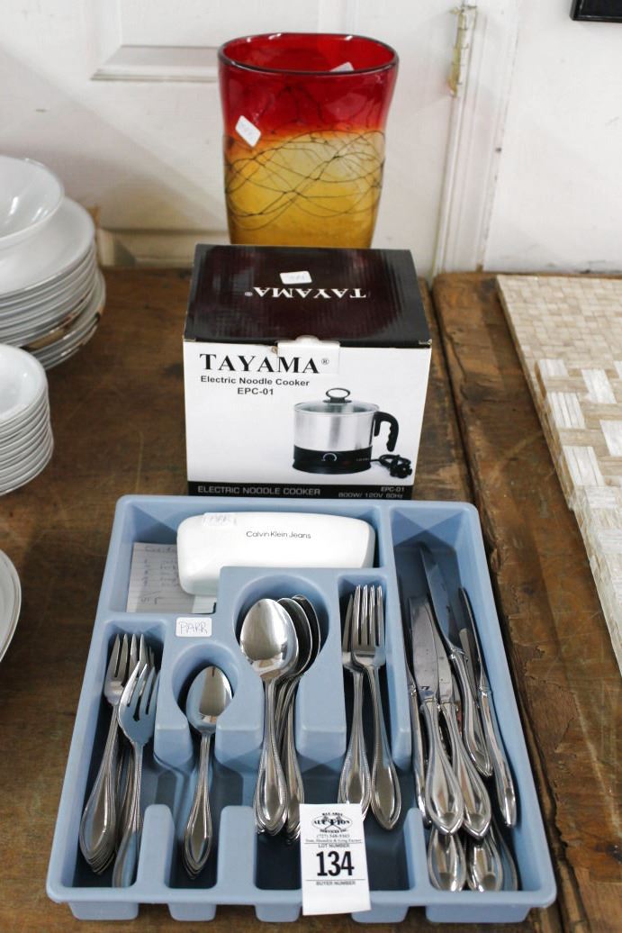 Oneida Utensils w/Bin, Noodle Cooker, Art Glass Vase