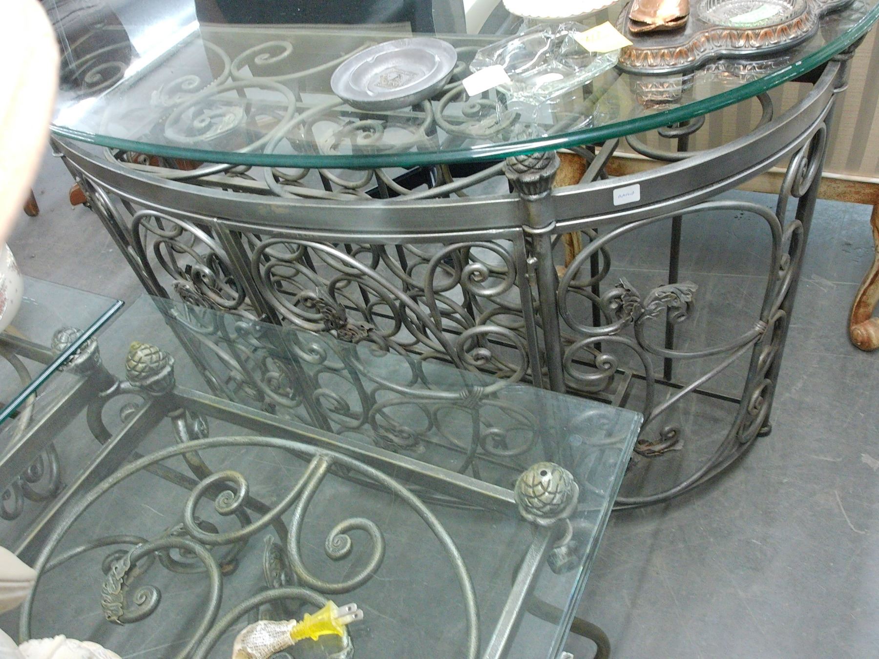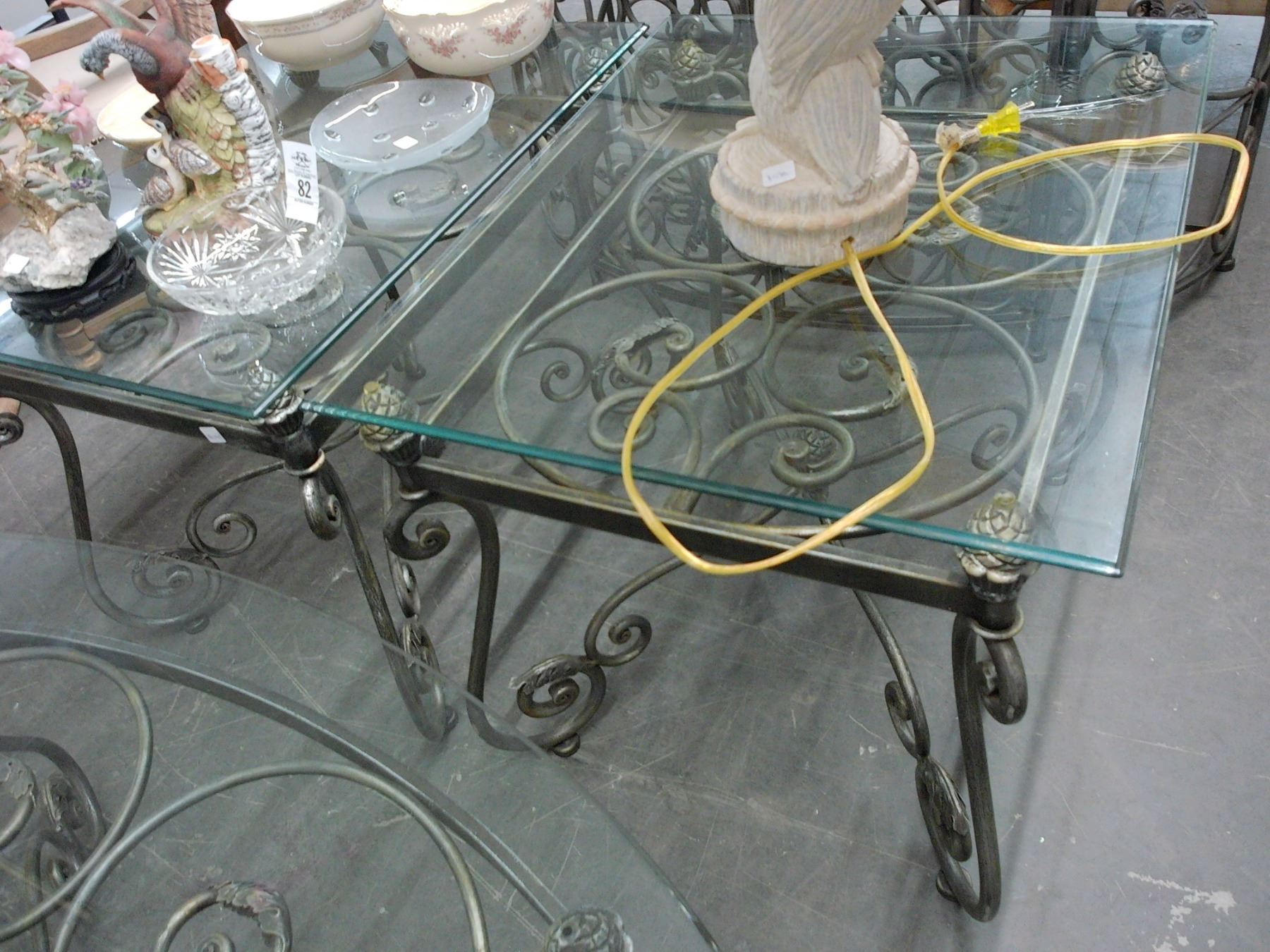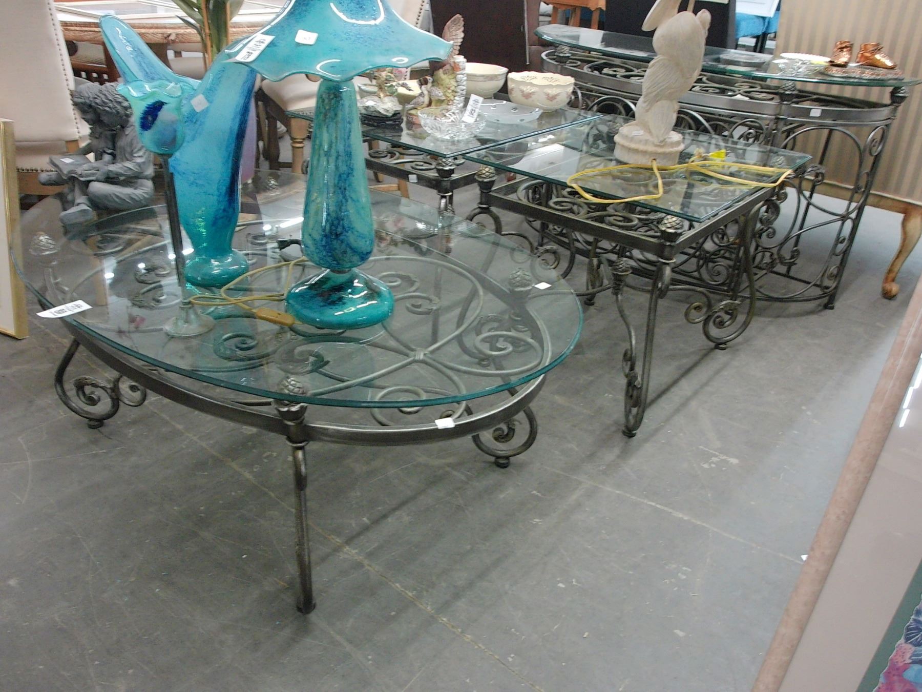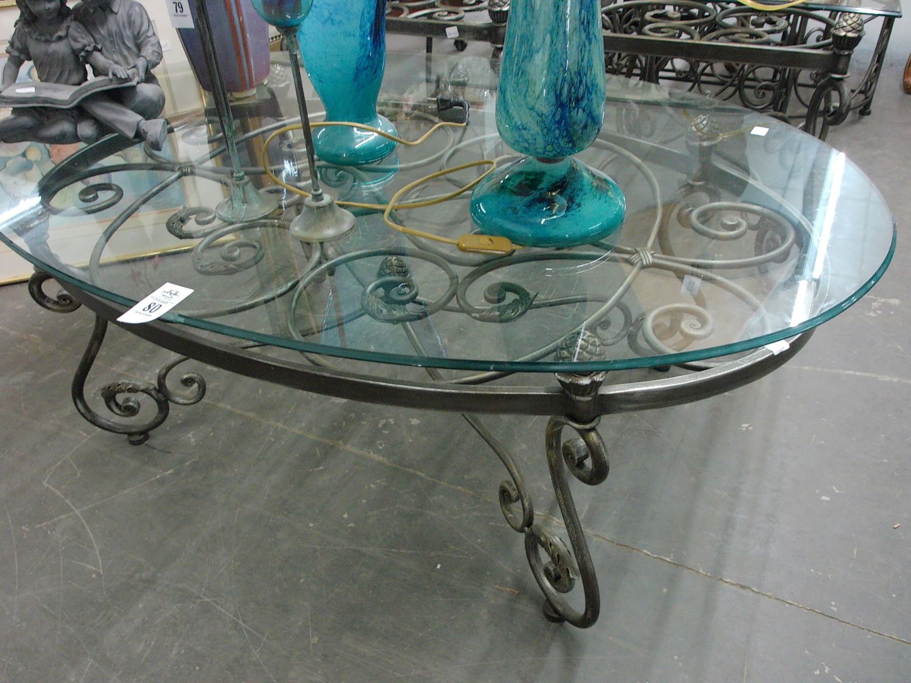 Ornamental Iron Base Glasstop Oval Coffee Table/End/Hall Tables - 4 Pc.