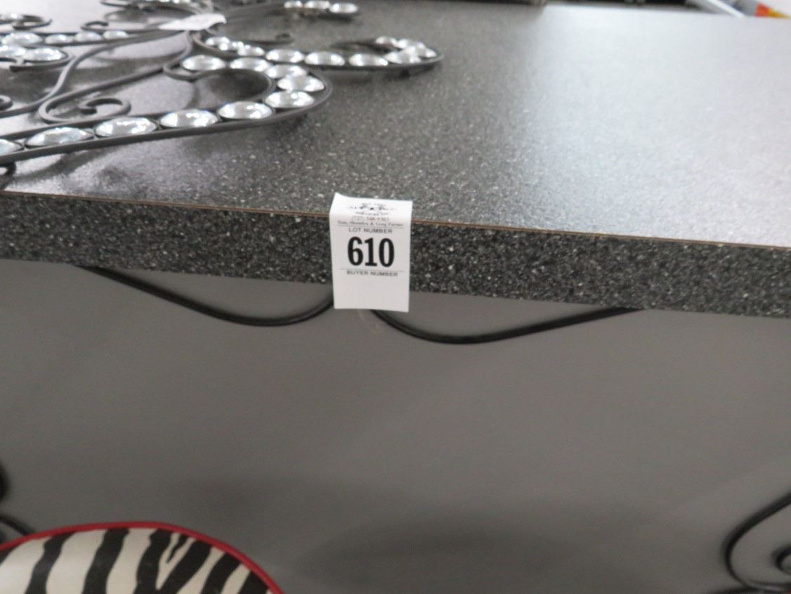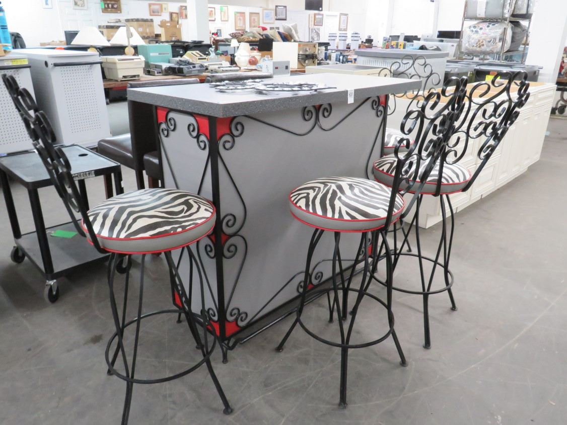Ornamental Iron Trim Small Bar w/Kick Rail & 4 Iron Trim Bar Stools + Wall Decor
