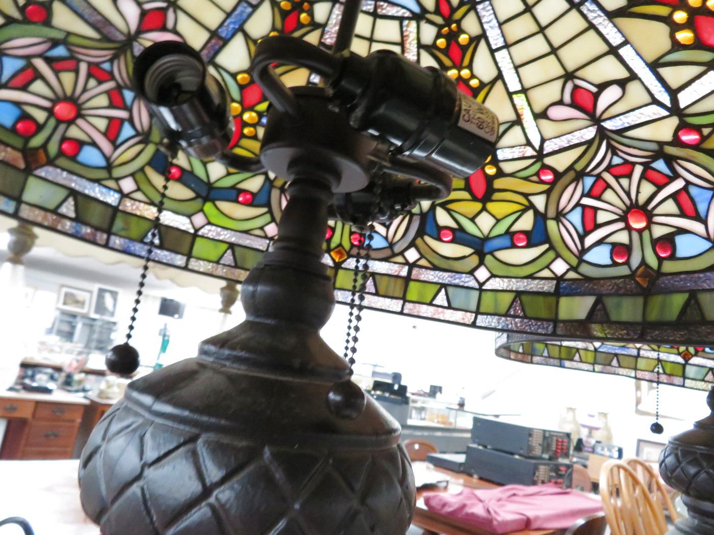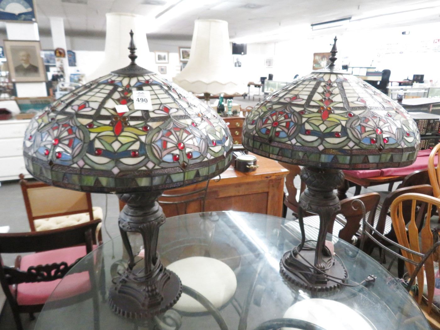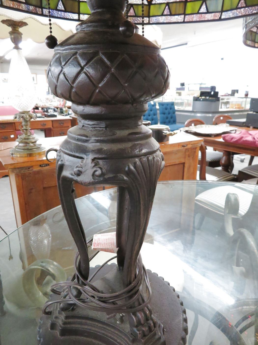 Ornate Cast Claw Foot Base Leaded Glass Large Lamp - Pair