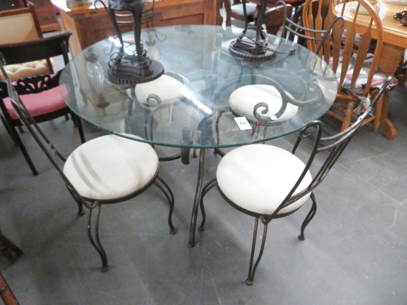 Ornate Metal Base Glasstop Round Dining Table w/4 Padded Iron Chairs