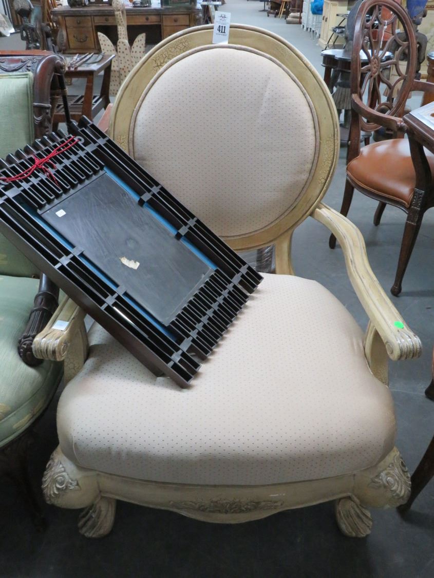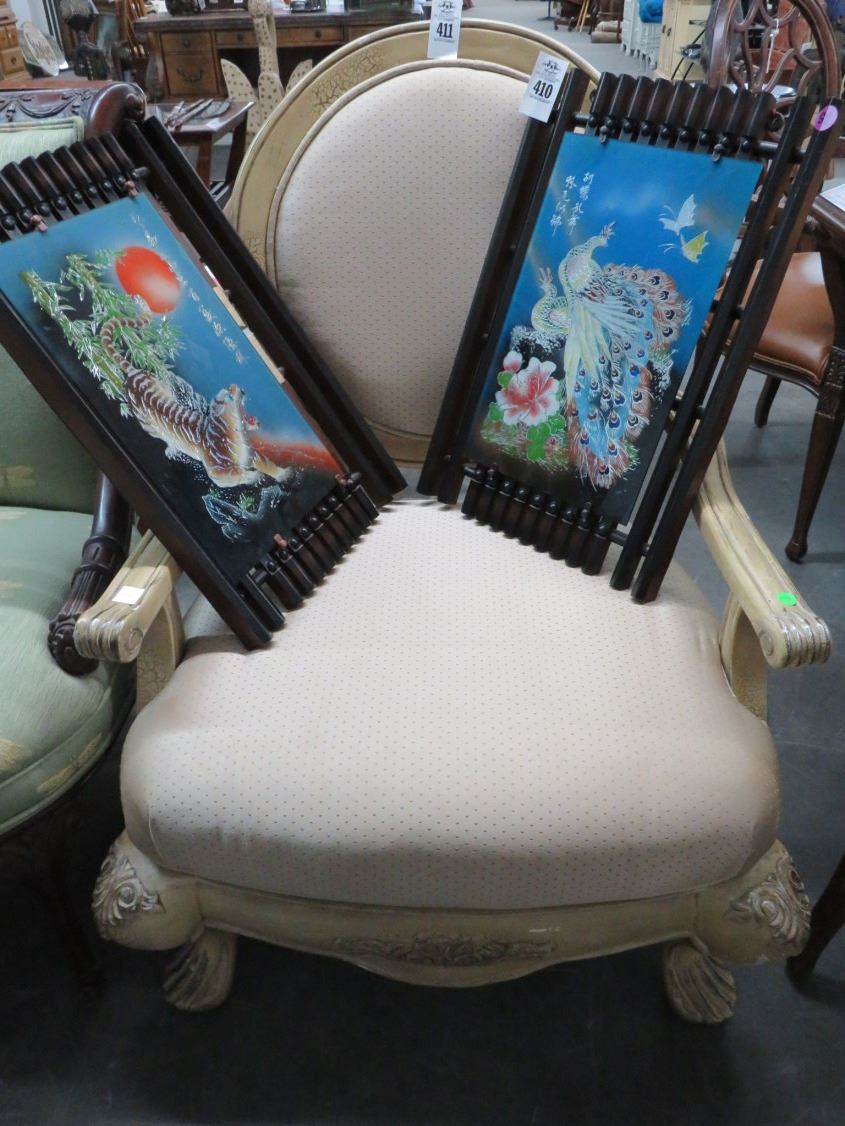 Ornately Carved Beige Cloth Armchair