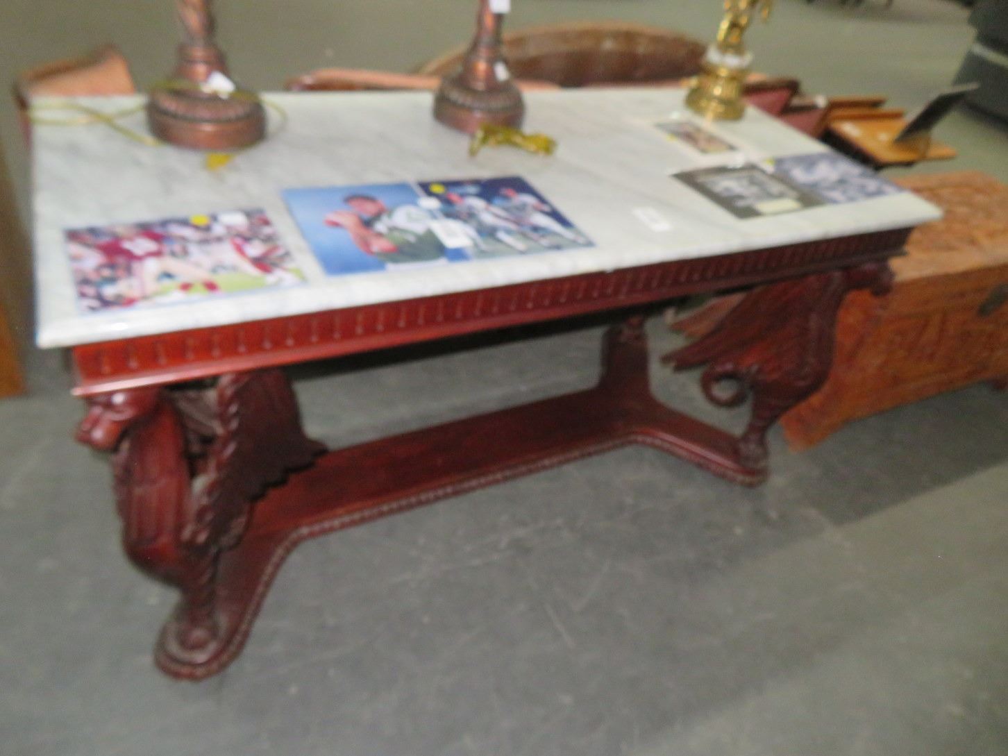 Ornately Carved Gargoyle Claw Foot Mahogany Marble Top Table