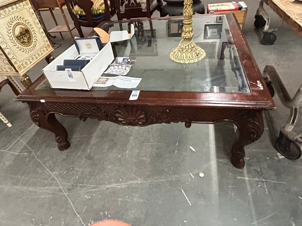 Oversized Carved Mahogany Glasstop Coffee Table