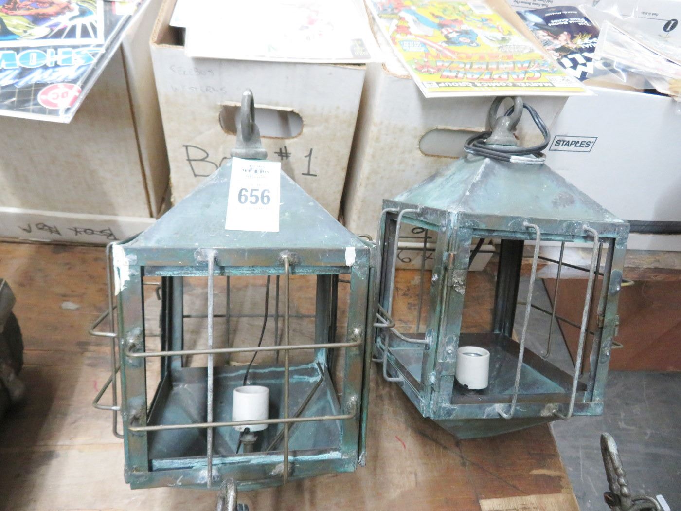 Pair of Vintage Metal Railroad Cage Hanging Lanterns