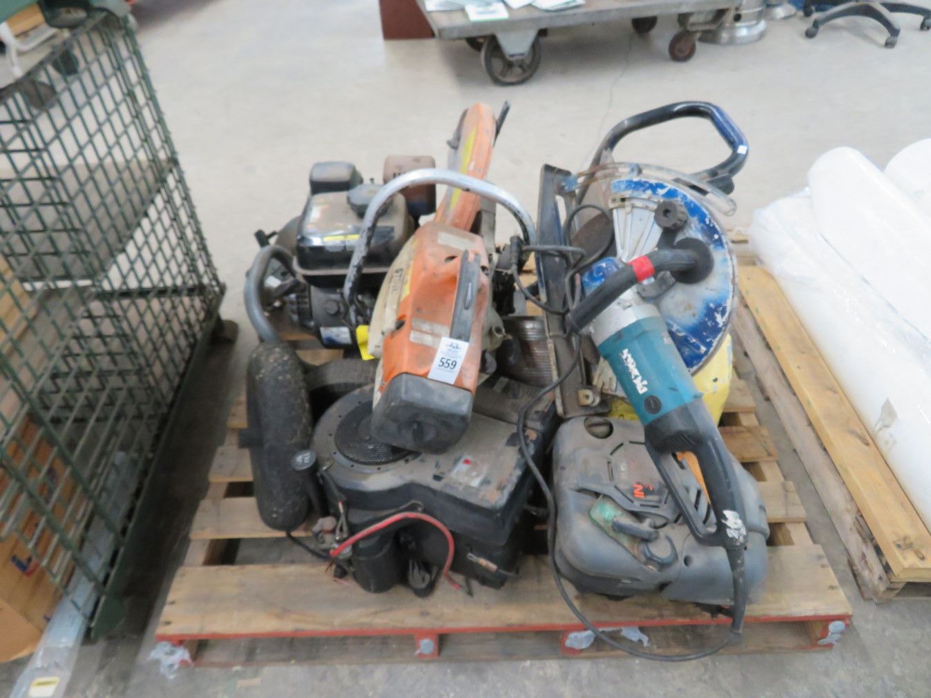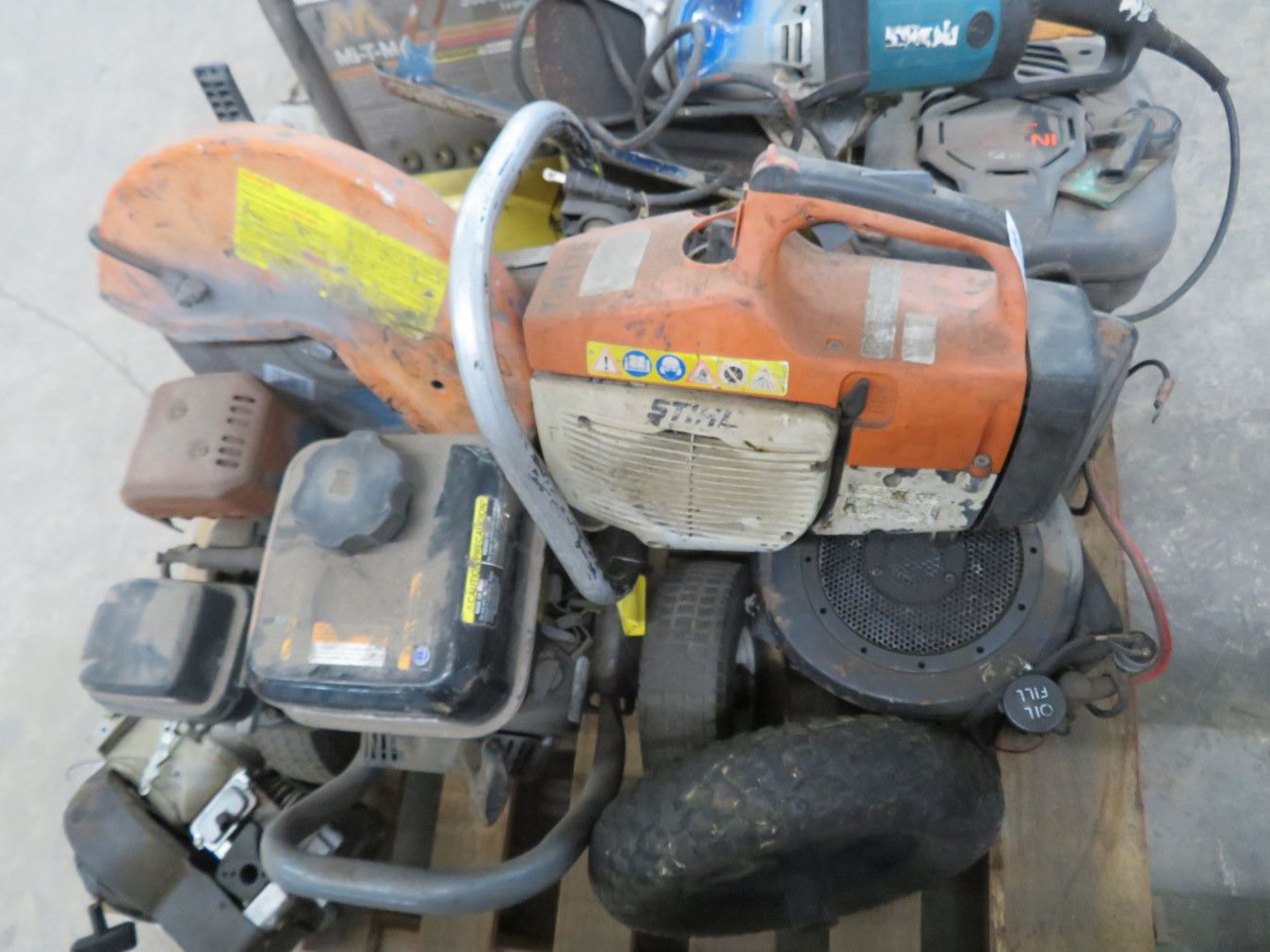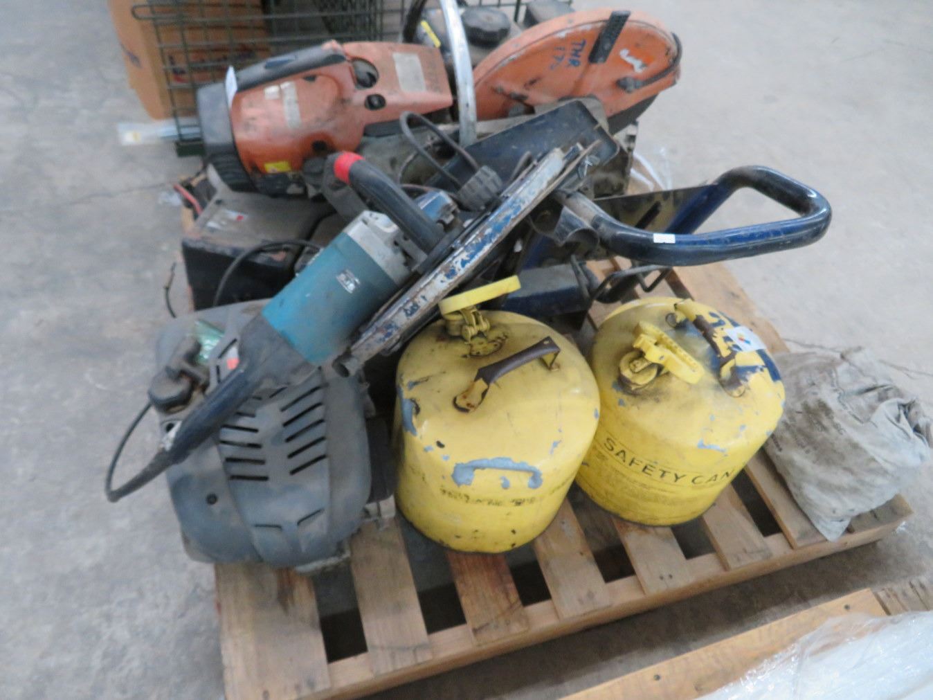 Pallet of Cut Off Saws (Nd. Rpr), Pressure Washer, Tanks & Motor
