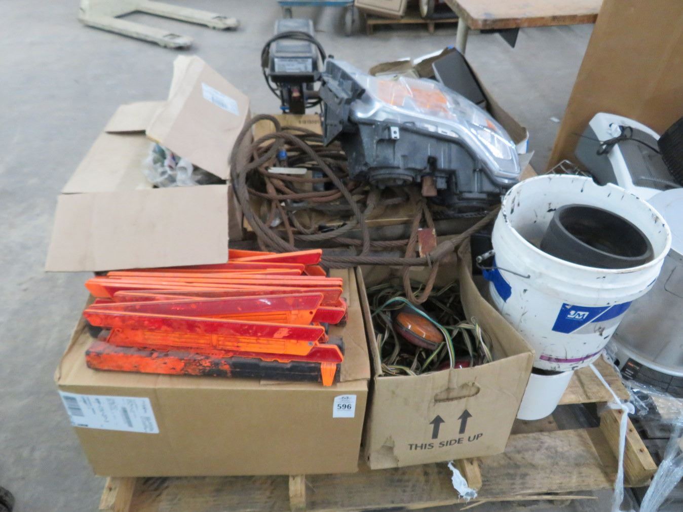 Pallet of Reflectors, Truck Headlight Kit, Clamps, Cords, Vises Drill Press