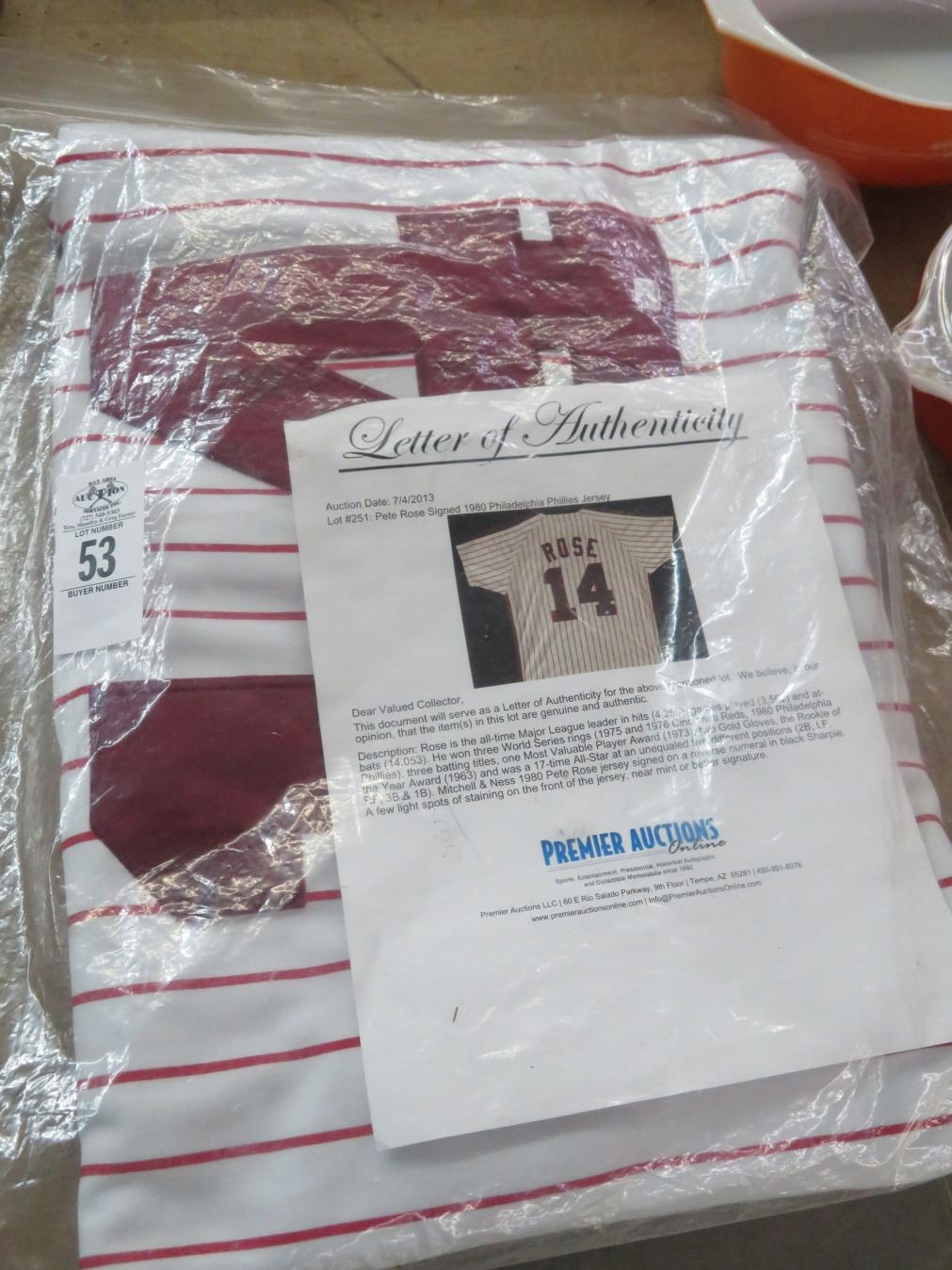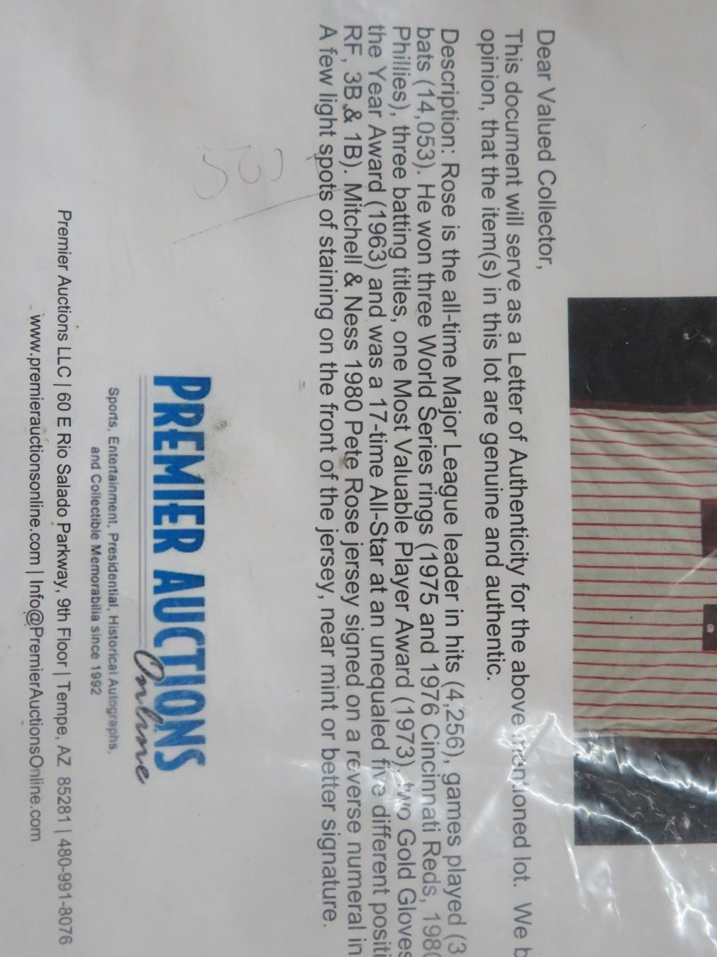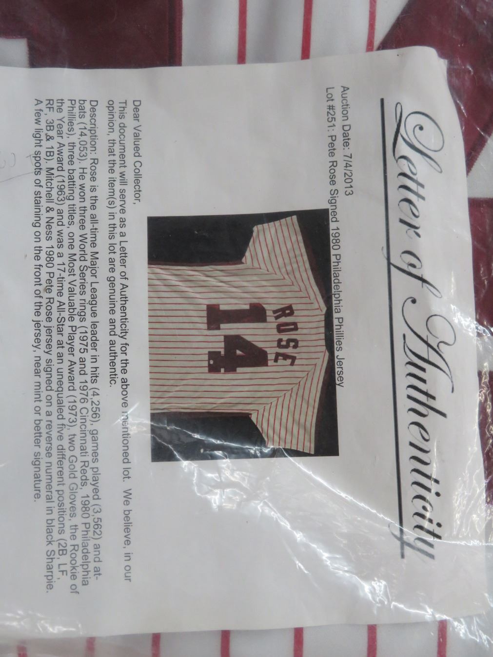 Pete Rose Autographed 1980's Phillies Jersey w/Letter of Authenticity