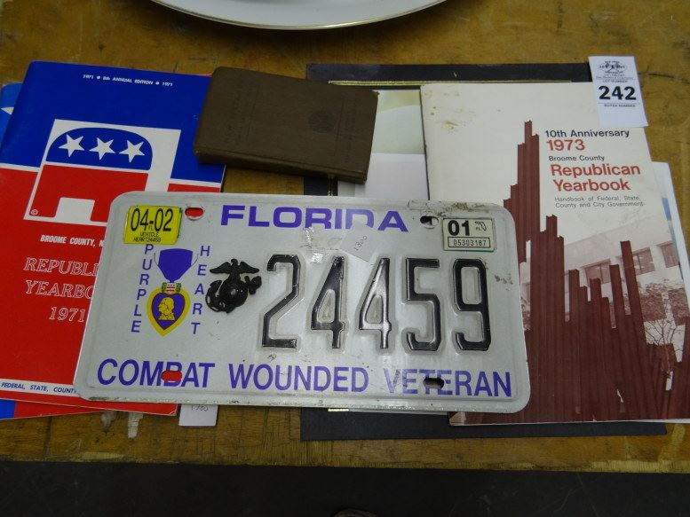 Political Memorabilia, Purple Heart License Plate, Bible Present by Army to Soldiers 1941